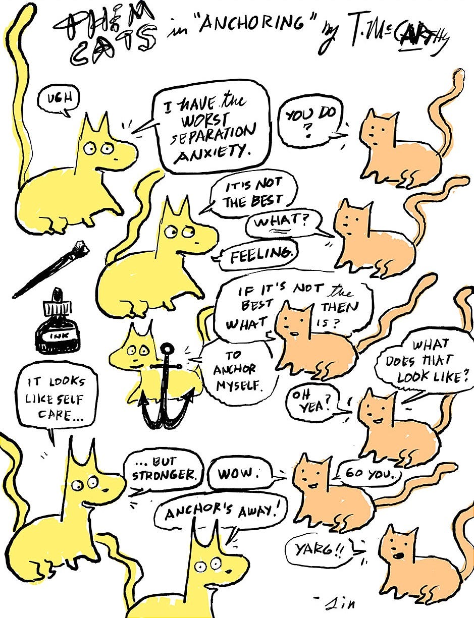 The visual of Me Cat literally holding an anchor while talking about emotional anchoring is a visual metaphor.