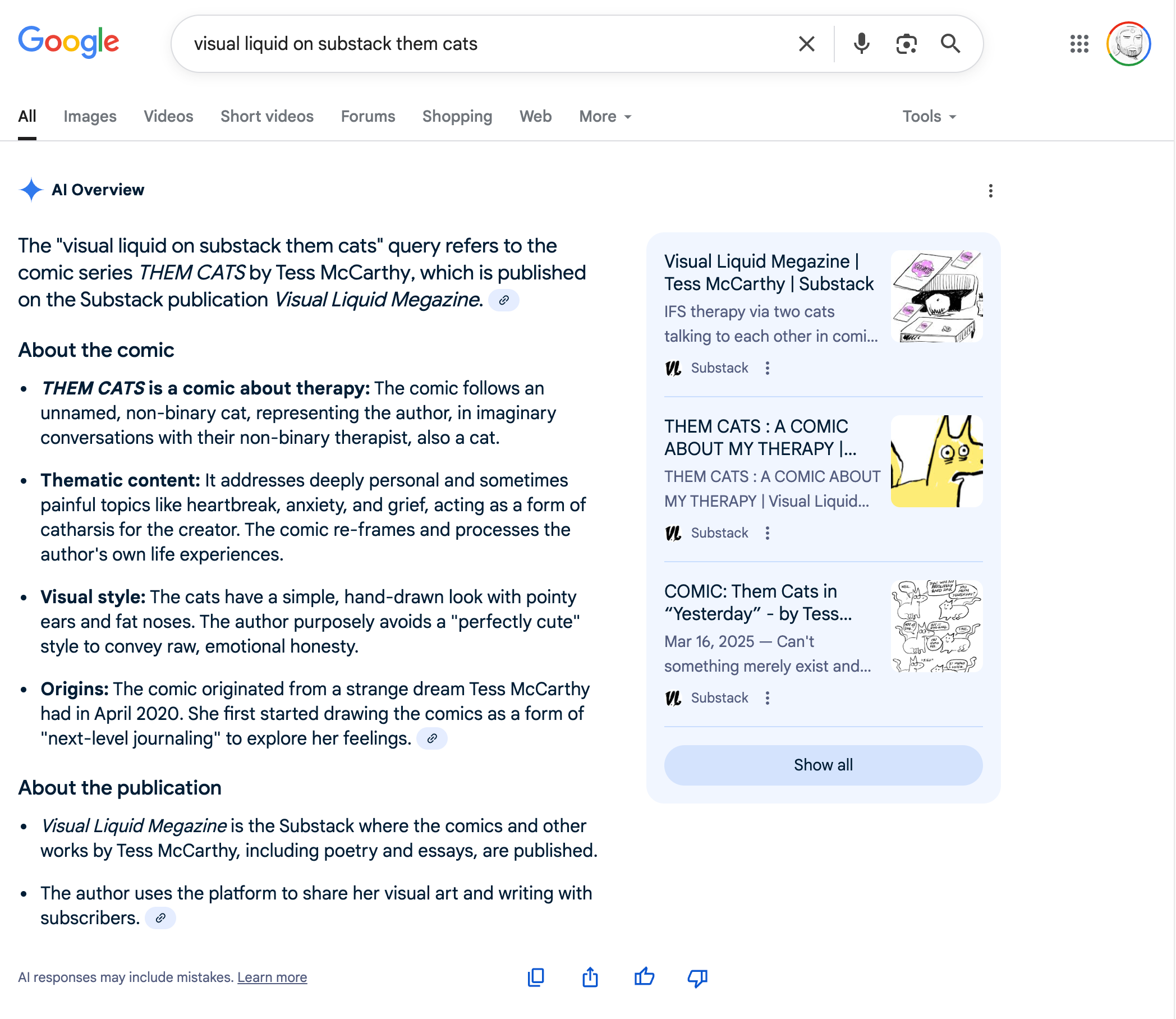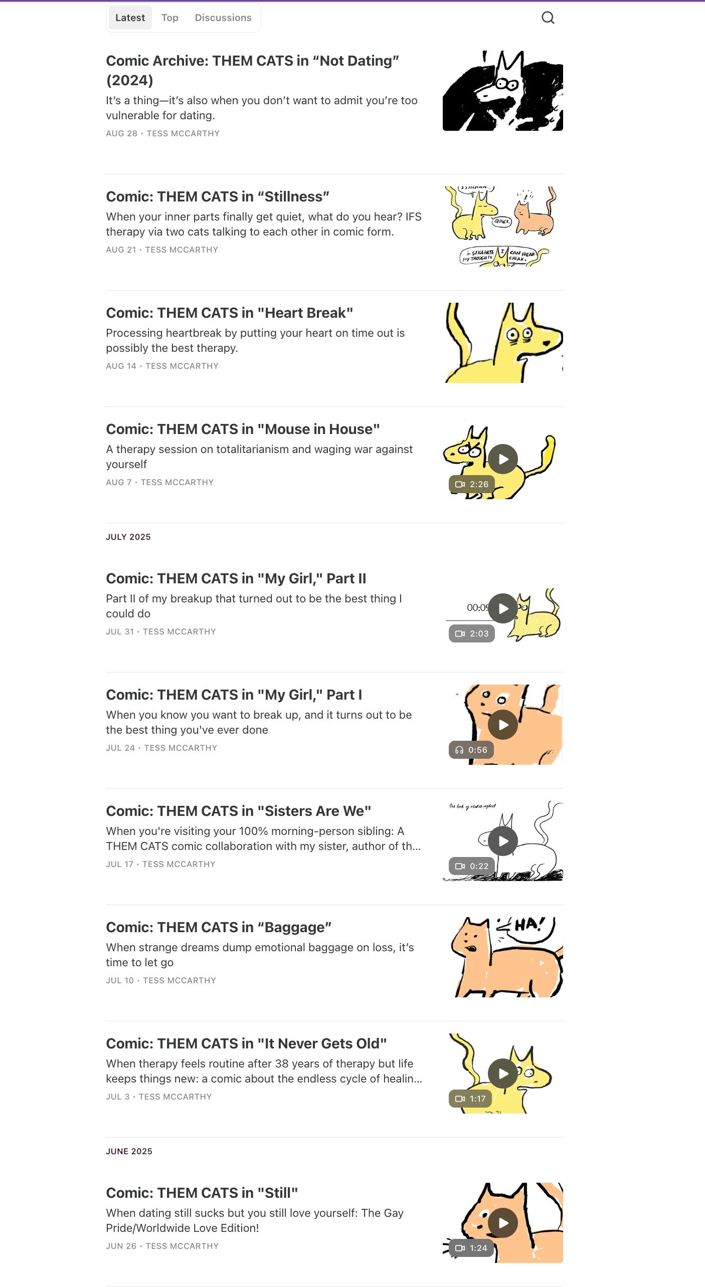 visualliquid.substack.com/s/them-cats each Thursday around 6 AM PST—can you handle it? I’ve got about 13 recent comics and I’ll be updating this on the Index.