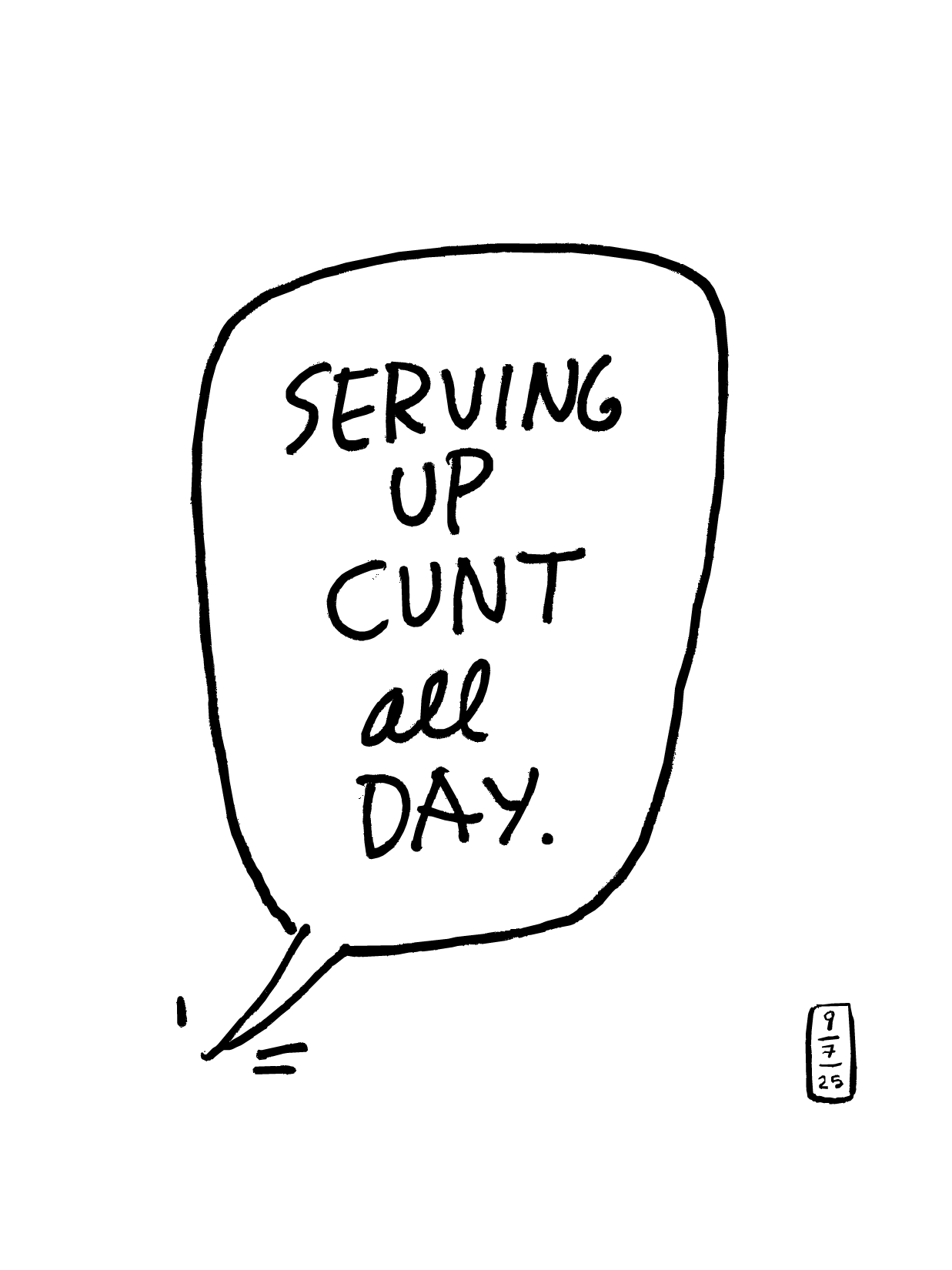 Tess McCarthy presents The Cunt Show, a collection of handwritten of cartoon talk bubbles she’s coined, Bubble Quotes that are hand drawn with a brush tool on tablet and printed as limited-runs each marked with Tess’s signature date chop — a unique, daily creation stamp.